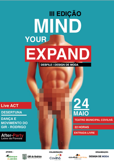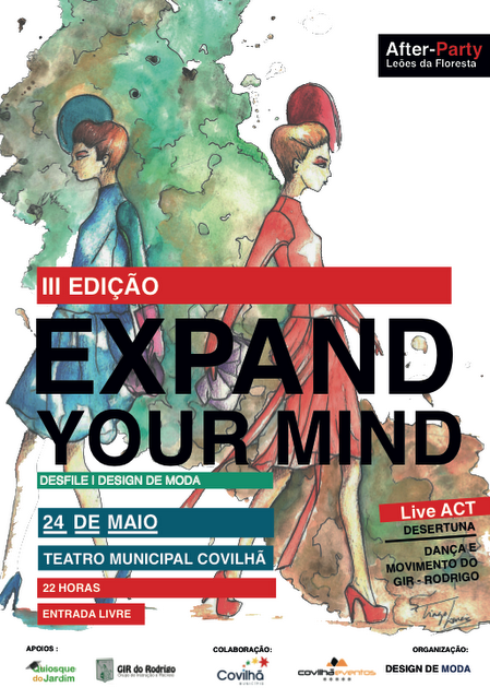 Esta quinta-feira, dia 24, realizar-se-á o terceiro Expand Your Mind, realizado pelos alunos de Licenciatura em DEsign de MOda, na Universidade da Beira Interior. Trata-se de um desfile que visa mostrar o talento de cada participante, de forma livre, potenciando cada um como designer e criativo. O desfile será no Teatro Cine, na Covilhã, pelas 22 horas. Apareçam!!!